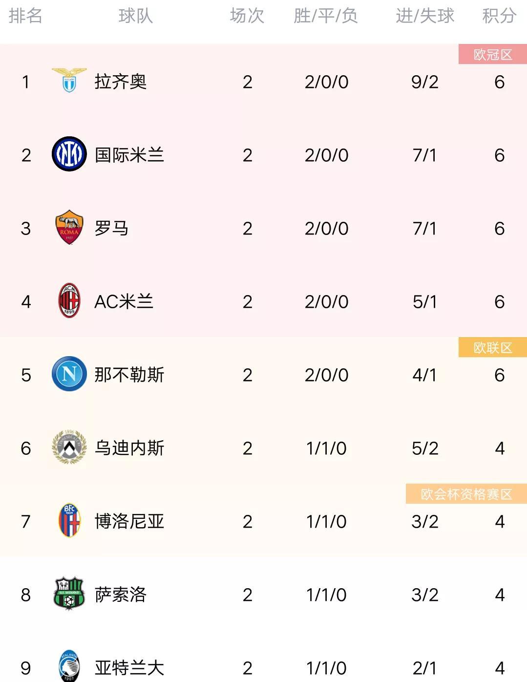 北京时间8月30日,意甲第2轮的比赛全部结束,其中罗马4-0萨勒尼塔纳,米兰4-1卡利亚里,拉齐奥6-1狂胜斯佩齐亚,亚特兰大0-0博洛尼亚,尤文图斯0-1爆冷输恩波利,目前在最新的积分榜上,拉齐奥拿…